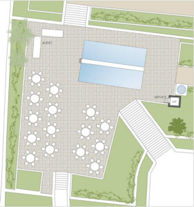 Γ.2.1 Ένα αναψυκτήριο τοποθετείται στη δυτική πλευρά του κήπου σε άμεση σχέση με παιδική χαρά. Είναι σαφές ότι η γεωμετρία της διαμόρφωσης τού κήπου, καθώς έχει βαρύνουσα αξία δεν μπορεί να αλλοιωθεί. Για το λόγο αυτό και η προτεινόμενη λύση ακολουθεί, ακριβώς, τα υφιστάμενα περιγράμματα στη διαμόρφωση τόσο των χώρων ανάπτυξης τραπεζοκαθισμάτων όσο και του χώρου που θα φιλοξενήσει την παιδική χαρά.